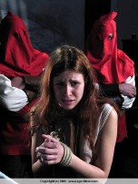 Three girls are seen huddled, then strung up naked, quaking, and shivering in a dungeon-like room and panned head to foot by the camera. No producer depicts this better. The girls are young, frightened, and helpless--realistic normal girls not runway models or dancers. Red-masked guards enter--the girls squirm in panic.
